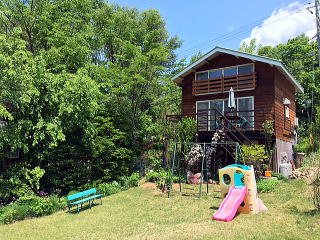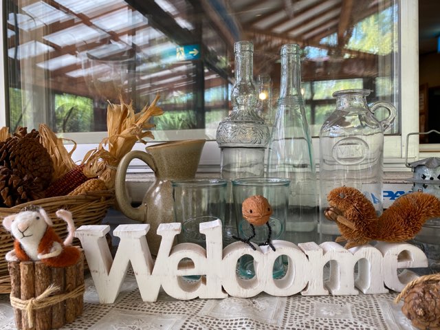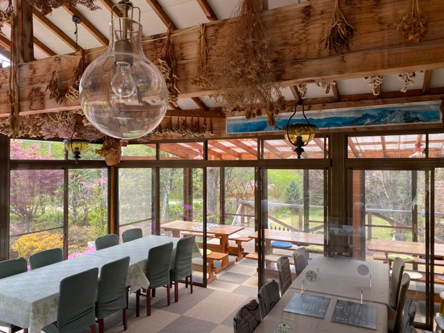 全面ガラスのダイニング。カワイイお花を眺めながらの食事。