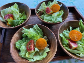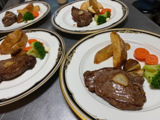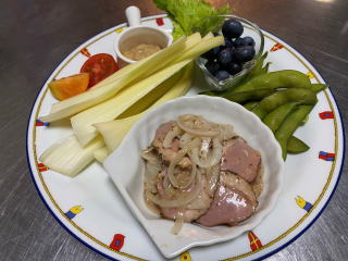 要望により夕食を野外テラスでの バーベキューにできます! (夏期間)グループに好評です メニュー ニジマス、お肉、焼き野菜、焼きそば、おにぎり、生野菜